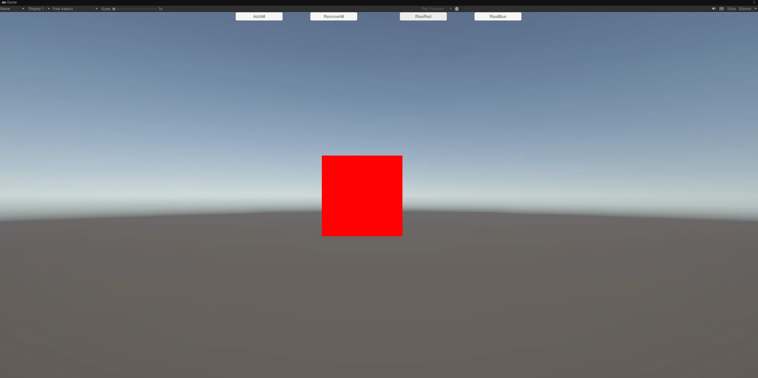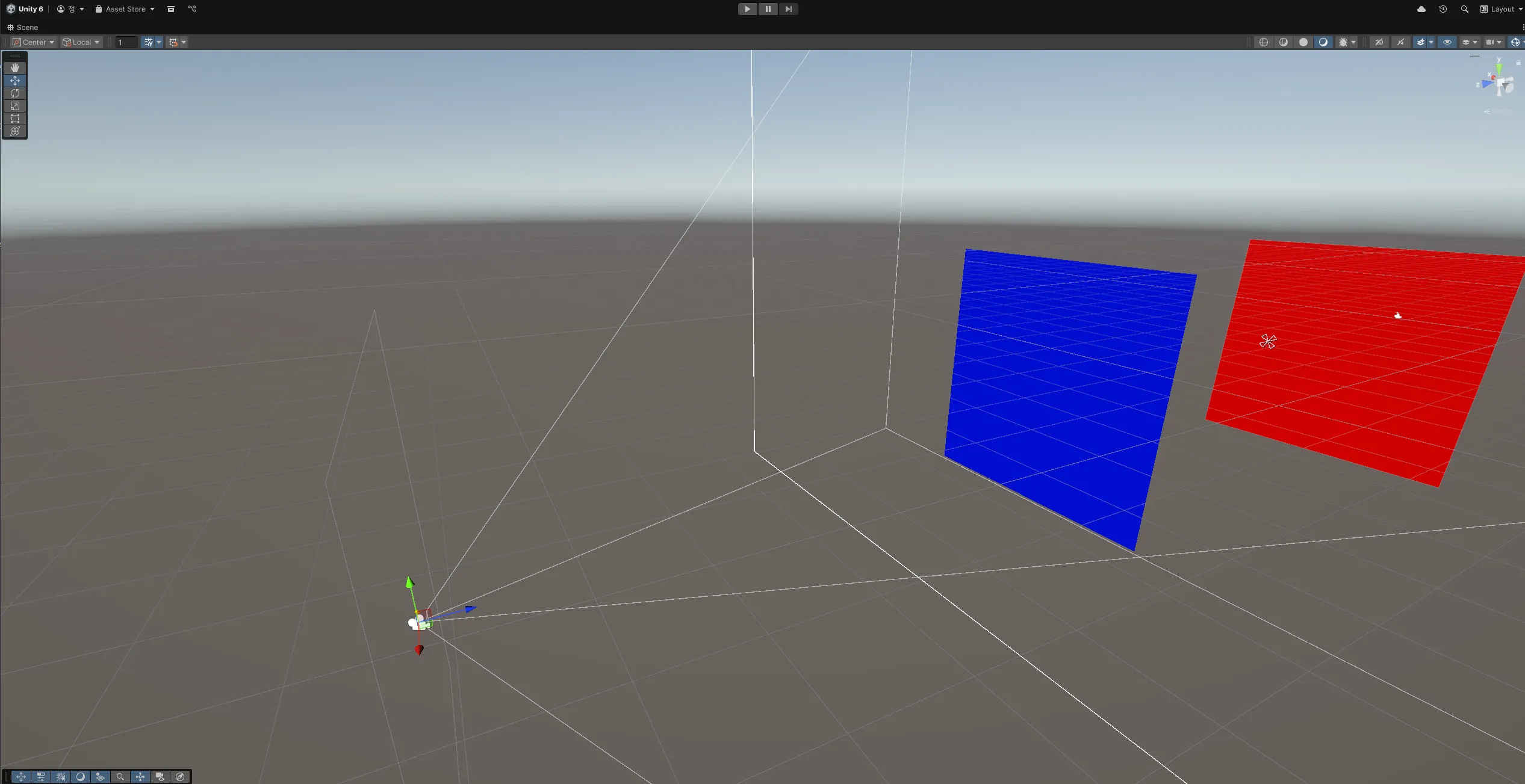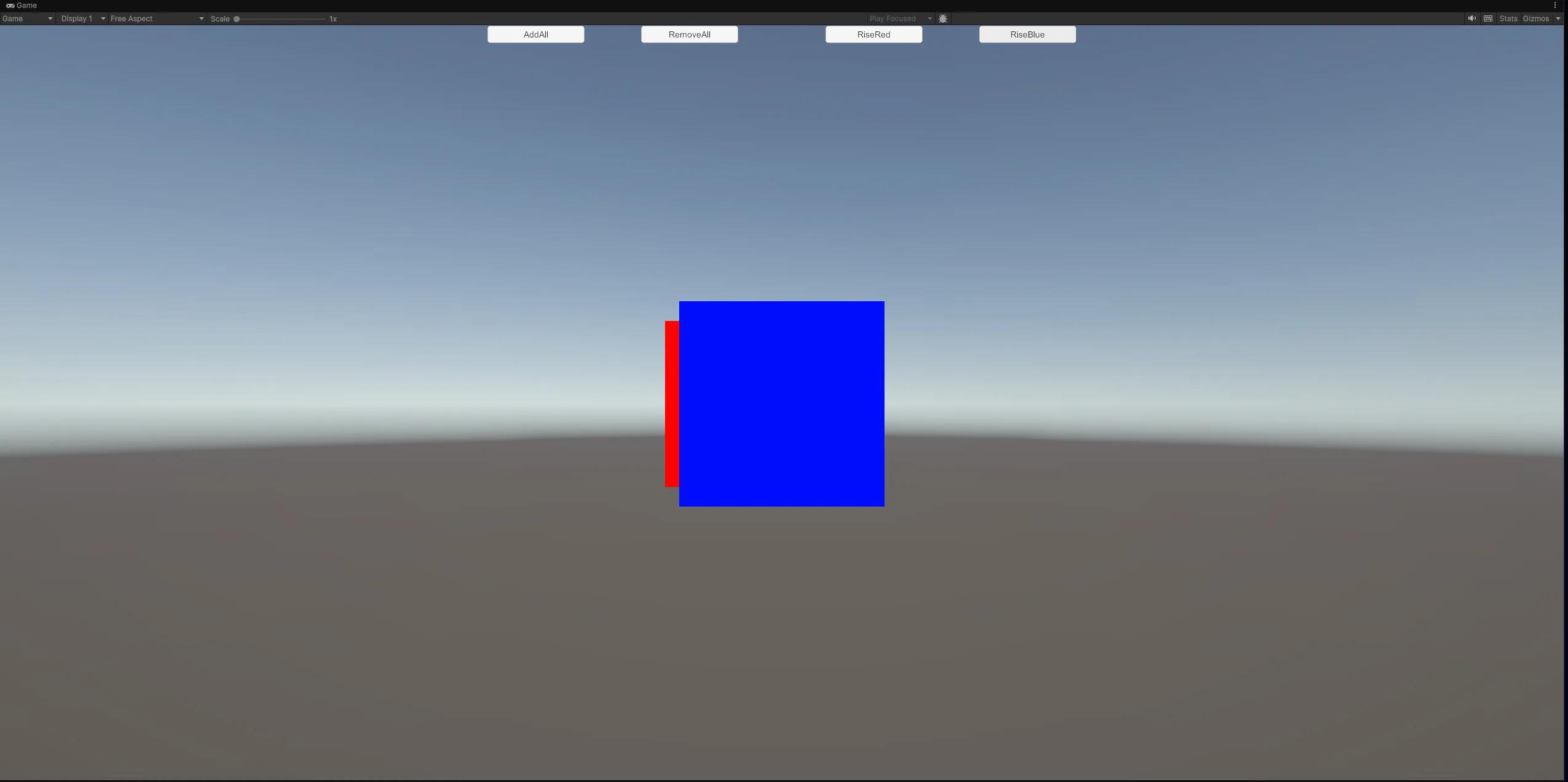 여기까지 잘 따라했다면 빨간색이 파란색의 앞에 있는 것처럼 화면이 비칠 것이다. 만약 반대로 파란색이 앞에 오게 하고 싶다면 카메라 스택의 BlueUICamera와 RedUICamera의 스택 순서를 바꾸면 될 것이다.