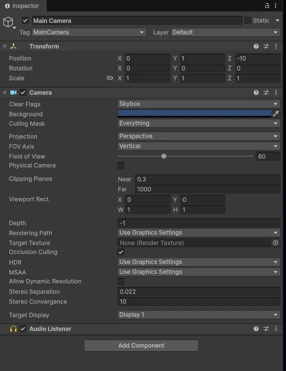 아래 사진은 각각 빌트인과 URP 프로젝트의 카메라 Inspector이다.