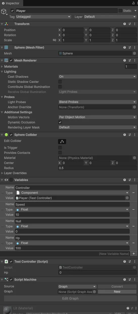 위의 사진이 Controller에 붙어있는 Test(Script Graph)이다. 다른 오브젝트를 찾는 것은 코드와 비슷하다.