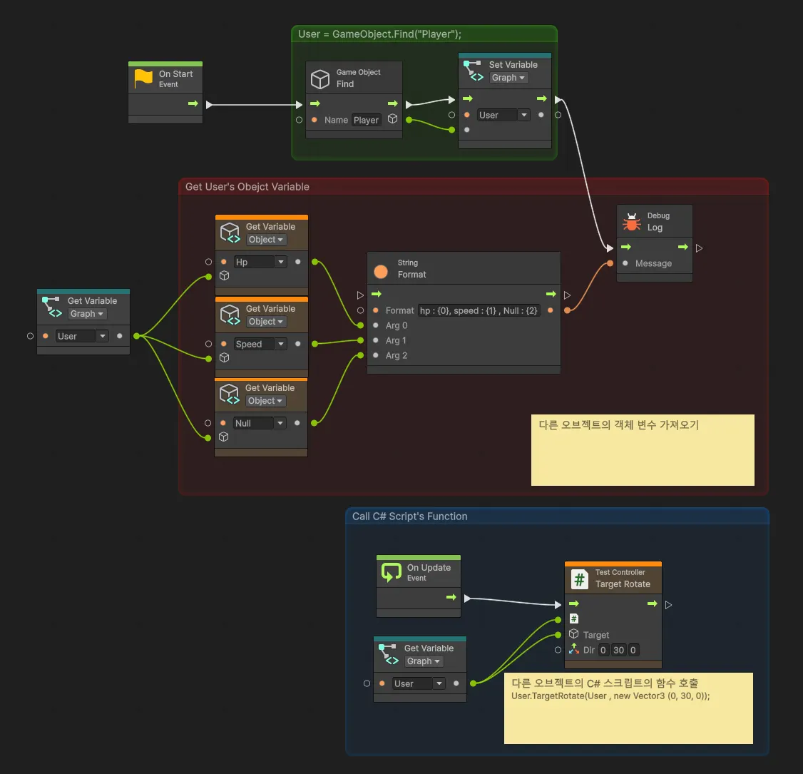 이때, 해당 스크립트는 그래프가 붙여진 오브젝트가 아니라, Player 오브젝트에 붙어있는 스크립트이다. 그래서 누구의 함수를 호출 할 것인지 지정하는 부분이 필요하다. 사진에서는 이미 User에 Player 오브젝트를 담아놨으므로 User의 출력 포트를 연결해놨다.