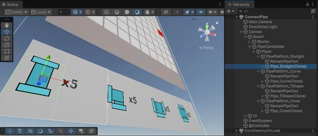 이렇게 총 4가지의 파이프 종류를 만들고 프리팹으로 만들었다. 이 파이프들이 생성되고 드래그 드롭을 대기하는 오브젝트를 만들고, 그곳에서 대기 중인 파이프들을 드래그하여 배치하면 원래 위치에 파이프가 생성되는 형태의 파이프 생성 로직을 생각했다.