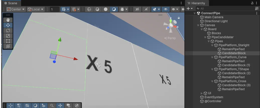 이제 파이프들은 CandidaterBlock의 자식으로 생성될 것이다. 그러니, PipeCandidater의 파이프 위치를 잡아주는 코드는 필요가 없어졌으므로 수정을 해준다.